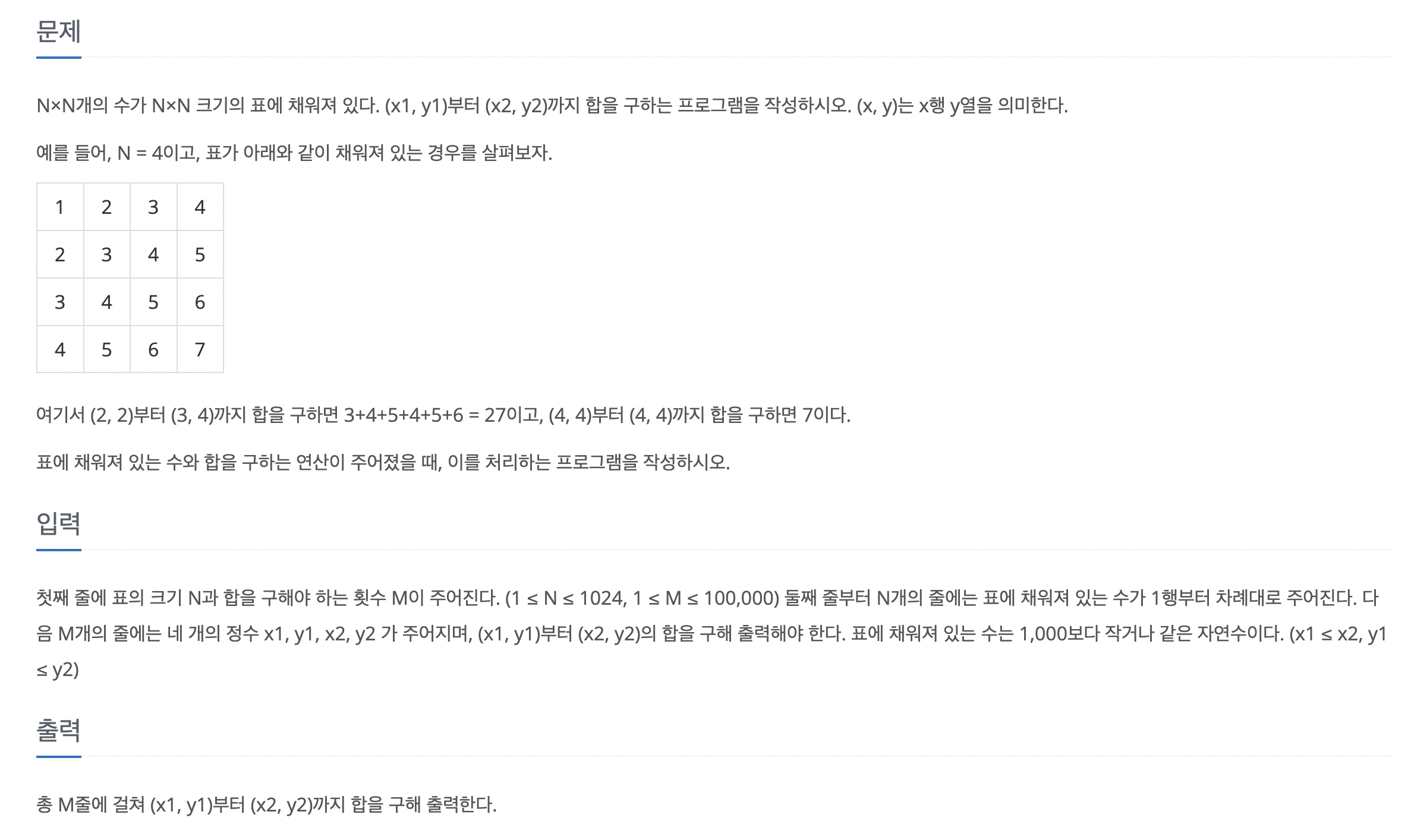 ○ 다이나믹 프로그래밍, 누적 합 Silver1 백준 11660번 구간 합 구하기 5 시간은 한시간 넘게 걸린거같은데 한번만에 통과함 ㅎㅎ 어떻게 계산해야될지 방법을 찾기만 하면 구현이 어렵진 않았음. 생각해내는건 쉽지않았음 ㅎㅎ (뻔한 말인가,,?) 누적 합과 DP의 경계가 살짝 모호하지만 행렬을 사용하니깐 공간에 값을 저장해나가는 게 누적합을 사용한 DP에 좀 더 가까운 것 같다는 느낌? //85696KB 584ms let nm = readLine()!.split(separator: " ").compactMap { Int($0) } let n = nm[0] let m = nm[1] var matrix: [[Int]] = [Array(repeating: 0, count: n+1)] for _ in 0..