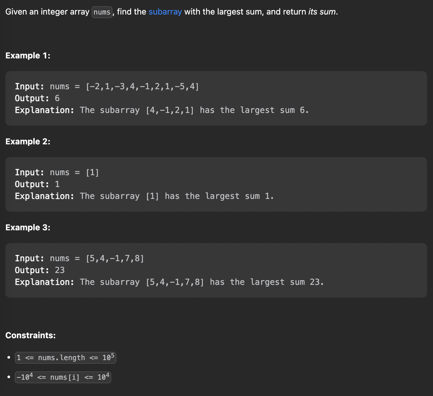× Dynamic Programming, Divide and Conquer | Medium LeetCode 53. Maximum Subarray for문 중첩해서 돌려서 O(n^2) 으로 풀었더니 당연히 시간초과 뜸,, Time Limit Exceeded 더보기 subarray 하나씩 더해가면서 값 저장하는 방식,, let solution = Solution() print(solution.maxSubArray([-2,1,-3,4,-1,2,1,-5,4])) //6 print(solution.maxSubArray([-2])) //-2 print(solution.maxSubArray([1])) //1 class Solution { func maxSubArray(_ nums: [Int]) -> Int { if ..